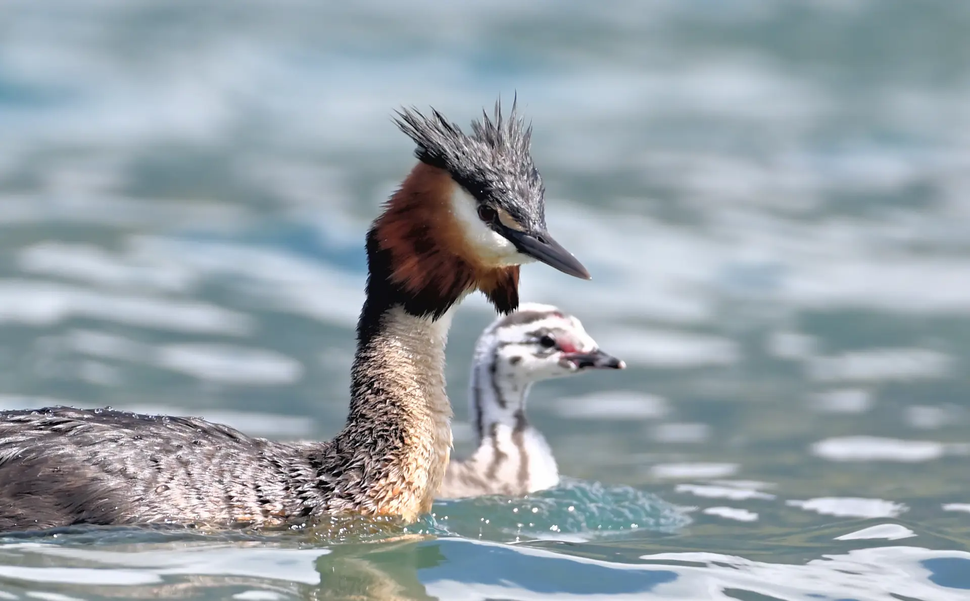 In the above video you can see the parents fishing for and feeding their grebettes — yes that's what they're called — and one of the grebettes taking a ride on mum's back.